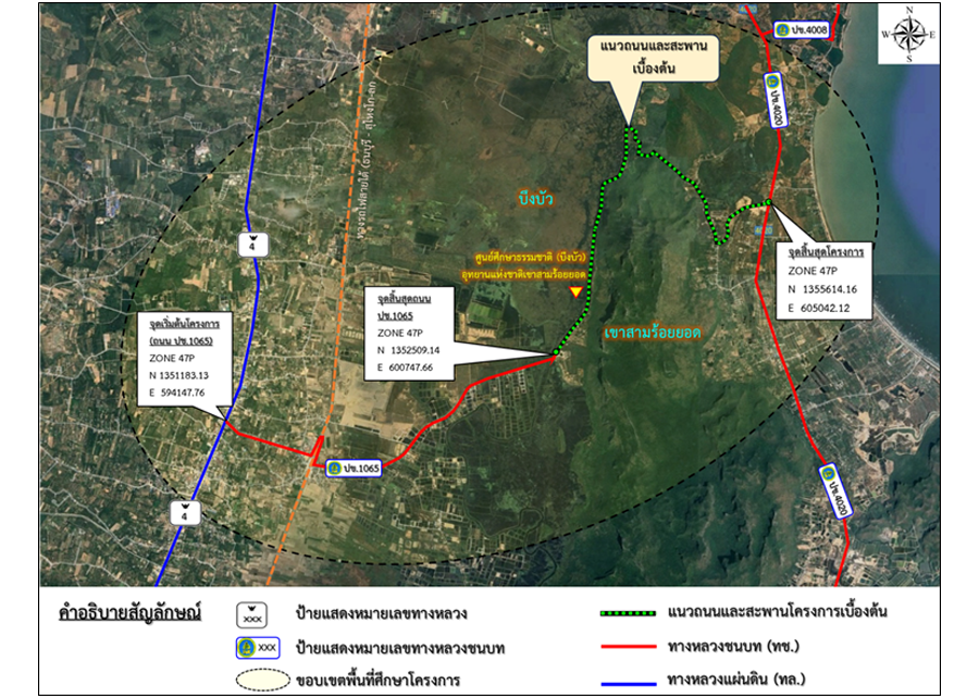 โครงการศึกษาความเป็นไปได้และจัดทำรายงานการประเมินผลกระทบสิ่งแวดล้อมเส้นทางท่องเที่ยวถนน บึงบัว - ชายหาดสามร้อยยอด จังหวัดประจวบคีรีขันธ์ มีจุดเริ่มต้นแนวสายทางโครงการเชื่อมต่อกับถนนทางหลวงหมายเลข 4 และมุ่งตรงตามแนวถนนทางหลวงชนบทสาย ปข.1065 ต่อด้วยแนวถนนเดิมไปถึงศูนย์ศึกษาธรรมชาติ (บึงบัว) แนวสายทางโครงการจะเป็นถนนที่ลัดเลาะตามริมบึงและเชิงเขาในเขตอุทยานแห่งชาติเขาสามร้อยยอด ต่อด้วยแนวถนนท้องถิ่นเดิมผ่านพื้นที่ชุมชน ตำบลสามร้อยยอด อำเภอสามร้อยยอด จังหวัดประจวบคีรีขันธ์ เชื่อมต่อกับถนนทางหลวงชนบทสาย ปข.4020 ซึ่งเป็นส่วนหนึ่งของโครงข่ายถนนเลียบชายฝั่งทะเลภาคใต้ Thailand Riviera ระยะทางโครงการประมาณ 17.00 กิโลเมตร พื้นที่ศึกษาทั้งหมดจะครอบคลุมอยู่ในเขตการปกครอง 10 หมู่บ้าน 3 ตำบล 1 อำเภอ 1 จังหวัด